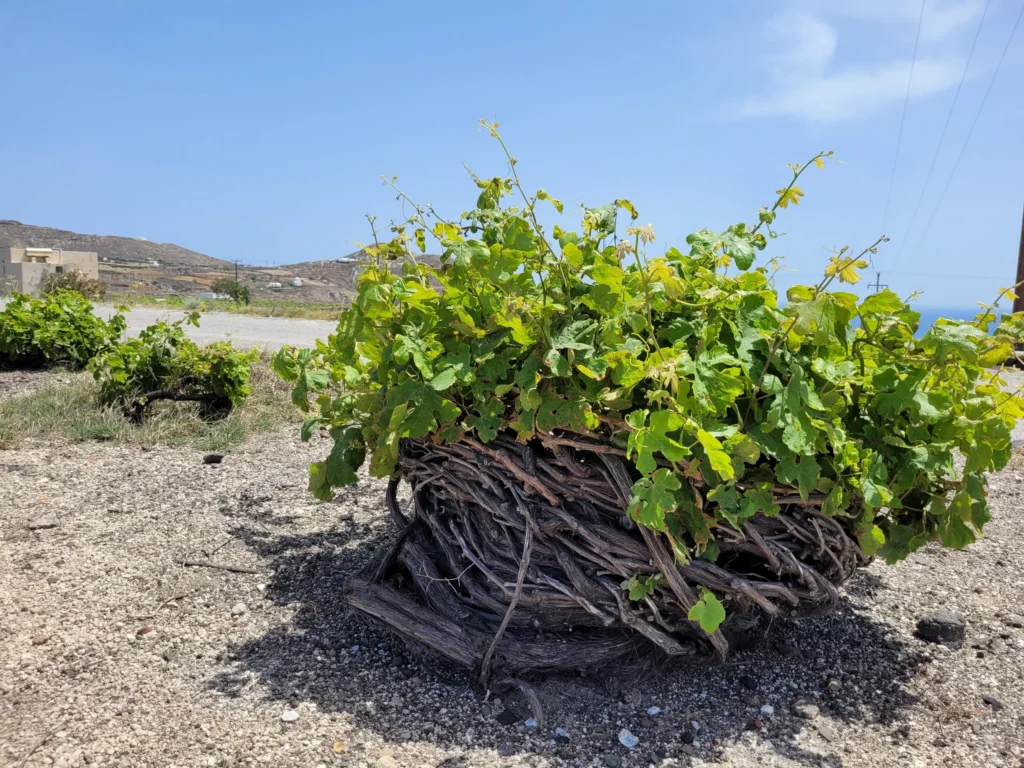 People here still use an ancient pruning system, called “kouloura” (basket) in Greek.In order to protect the clusters of grapes from the wind and the scorching sun, they tend to each individual vine; they ‘train’ the trunk, shaping it in a spiral that forms a basket. The grapes hang on the inside, protected by the trunk and leaves against the fierce winds and scorching sun. The great age of these plants gives them a very deep rooting system, using the water from the sub-soil. Even the humidity from the sea-mist, which settles on the plants and goes deep into the porous volcanic soil, does not go to waste.